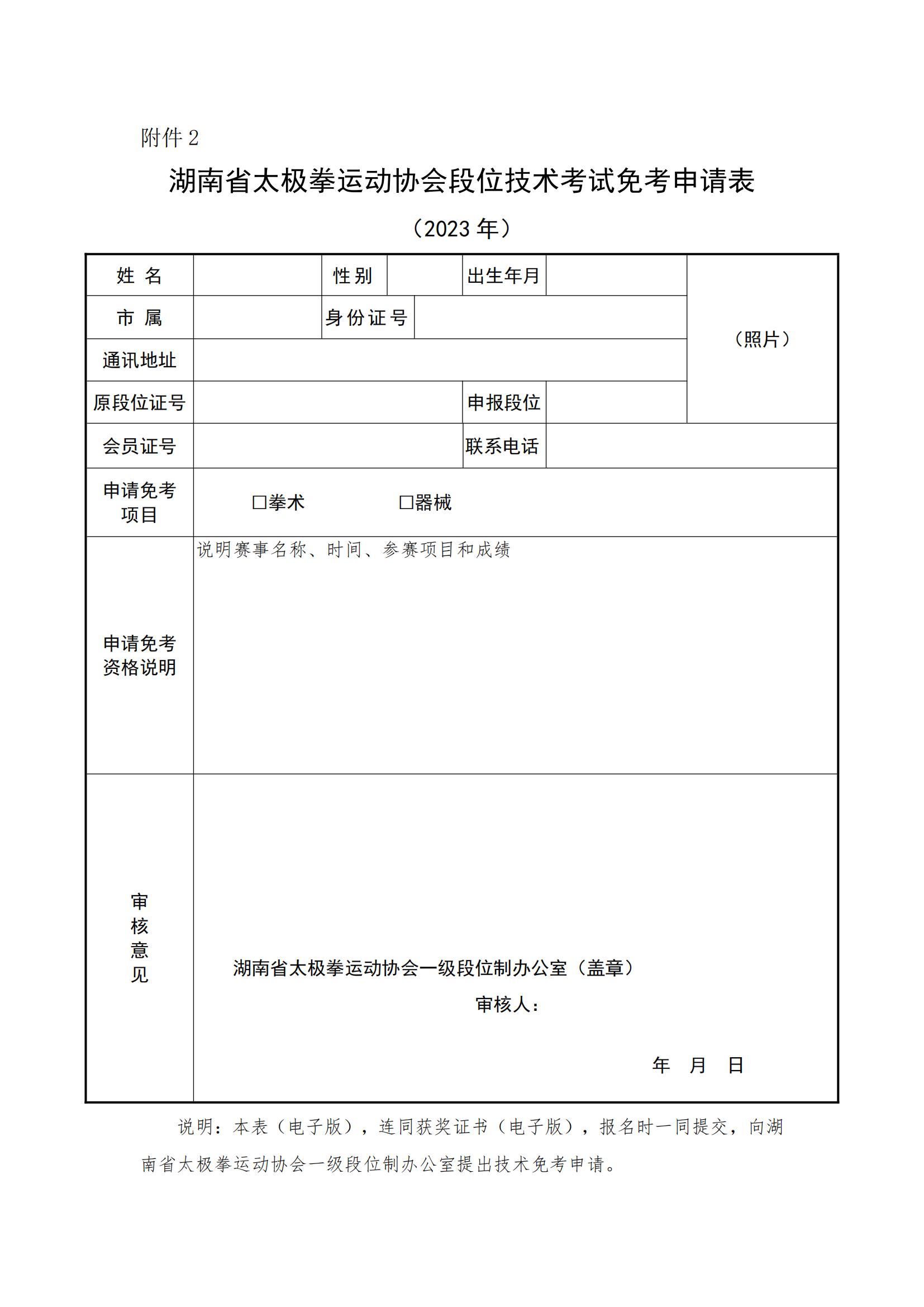 (二)申请技术免考人员需另填报《湖南省太极拳初段位技 术考试免考申请表》,连同 2023 年长沙市太极拳锦标赛获奖证 书(一项拳术一项器械)复印件于报名截止日前交本次考试联系 人,申请技术考试免考。