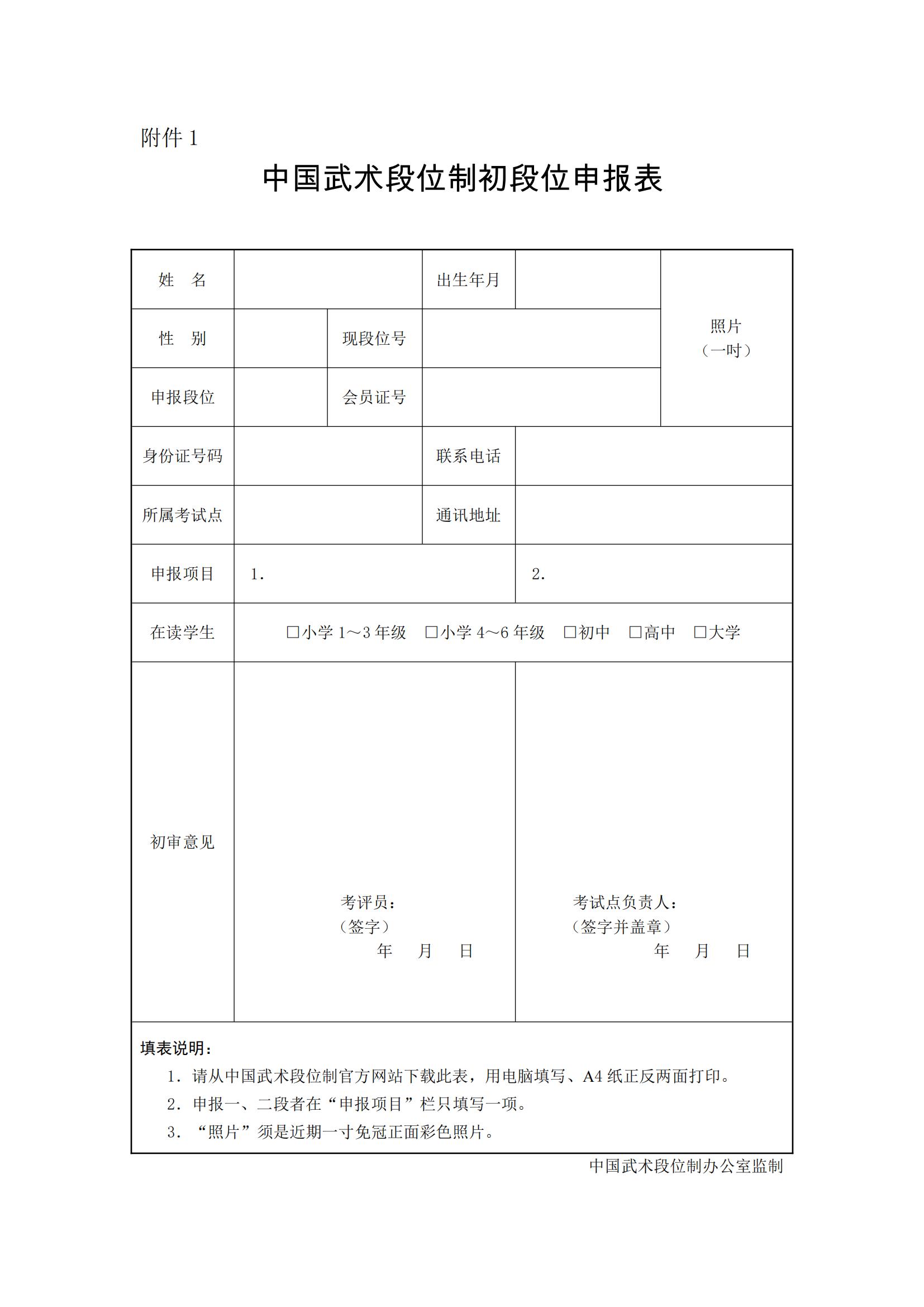 (一)考试人员填写纸质《中国武术初段位申报表》,贴本 人一寸免冠照片(2 张),于 5 月 9 日前交本次考试联系人,经 审核后,参加技术考试。